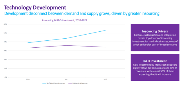 According to the IABM’s MediaTech spotlight, MediaTech best-of-breed buyers care more about innovation, interoperability & partnerships than any other factors. Control, customization and integration remain the top drivers of insourcing investment for media businesses, most of which still prefer best-of-breed solutions.